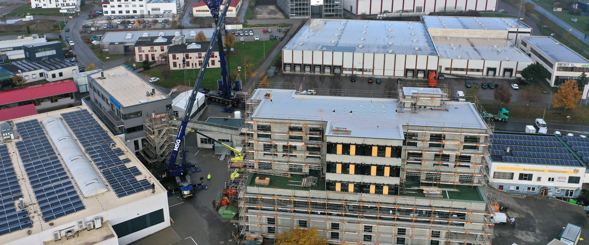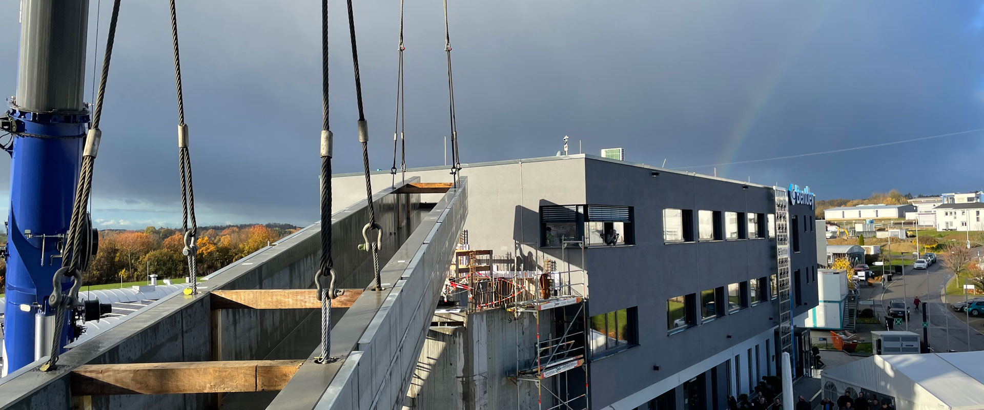 Am Montag, den 21.11.2022 wurde das neue, 22 m hohe Verwaltungsgebäude durch die Montage einer 25 m langen und 55 t schweren Fußgängerbrücke mit den Bestandsgebäuden verbunden. Unter der Anleitung der beiden projektbegleitenden Ingenieure, Thomas Silberberger und Marco Sauter, wurde die Brücke über eine Distanz von 50 m herangeführt und passgenau auf die beiden Gleitlager aufgesetzt. Das hoch belastbare Brückenfertigteil wurde in einem Sück von Fertigbau Wochner im eigenen Spannbetonfertigteilewerk in Schömberg hergestellt.