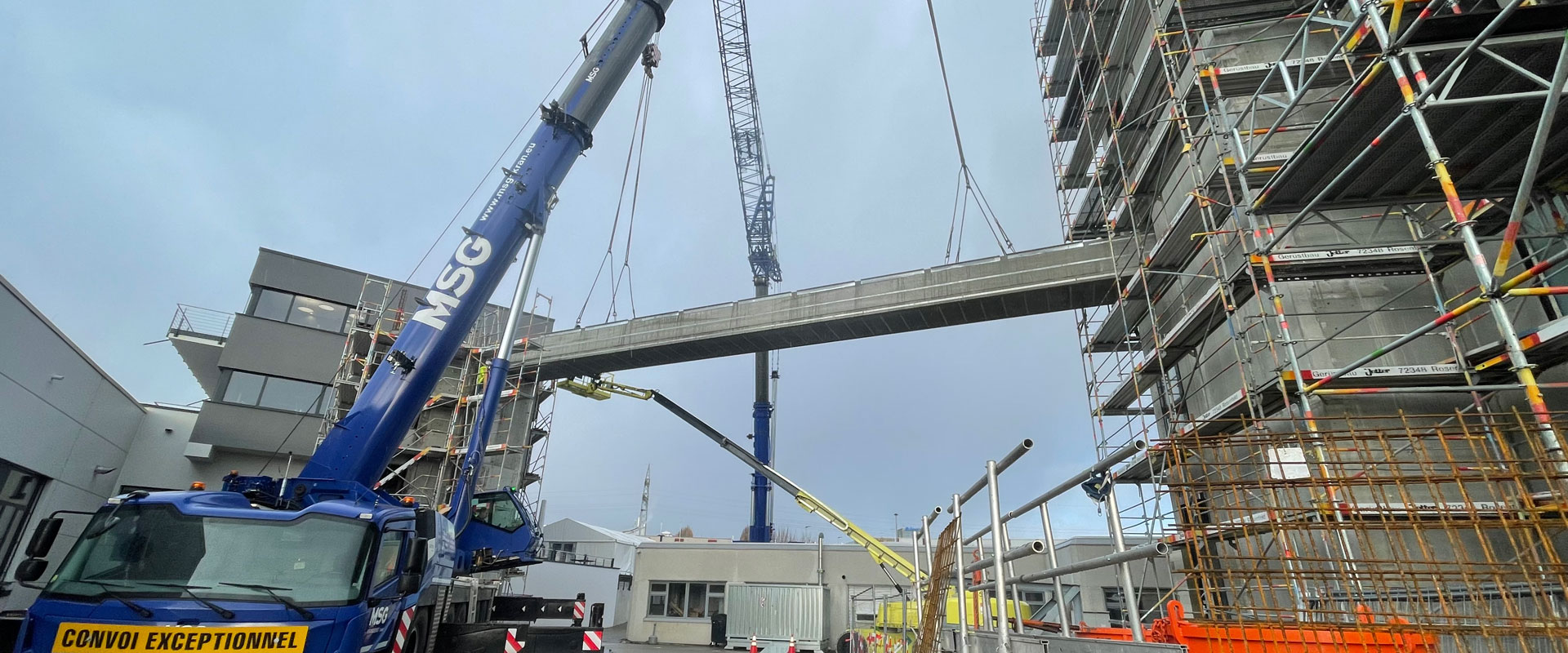 Montage der 25 m langen und 55 t schweren Gebäudebrücke zur Anbindung des Neubaus.